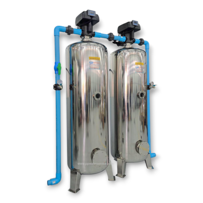 ถังกรองสแตนเลส24" 2ขั้นตอนสำหรับกรองน้ำบาดาลที่มีตะกรันหินปูน กรองตะกอนขุ่น ไว้ใช้ในโรงแรม รีสอร์ท อุตสากรรมที่ต้องการน้ำสะอาดไว้อุปโภค บริโภค