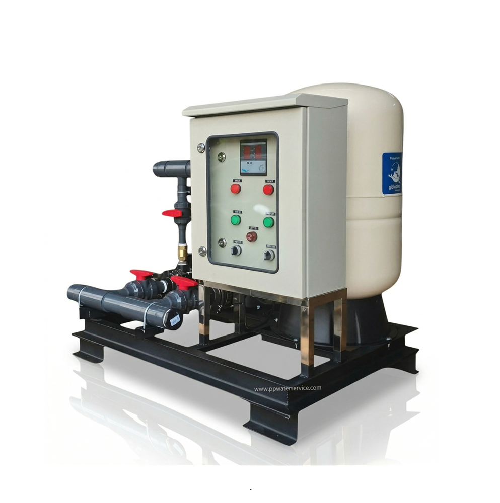 Booster Pump ชุดปั๊มสำหรับส่งน้ำอัตโนมัติใช้งานประกอบด้วย ปั๊มน้ำหลายใบพัดสองตัวพร้อมถังแรงดันขนาด 100 ลิตร เพื่อให้แรงดันสูงพร้อมทั้งประหยัดพลังงานมากกว่าระบบที่ใช้ปั๊มหอยโข่งทั่วไป