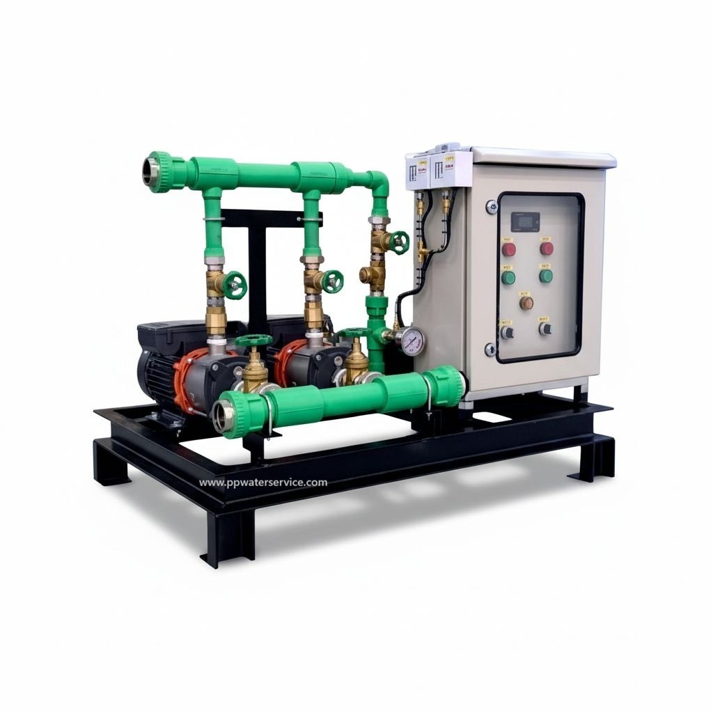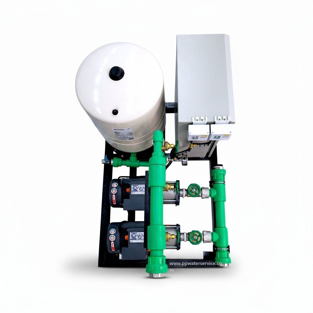 Booster Pump ชุดปั๊มสำหรับส่งน้ำอัตโนมัติใช้งานประกอบด้วย ปั๊มน้ำหลายใบพัดสองตัวพร้อมถังแรงดันขนาด 200ลิตร เพื่อให้แรงดันสูงพร้อมทั้งประหยัดพลังงานมากกว่าระบบที่ใช้ปั๊มหอยโข่งทั่วไป